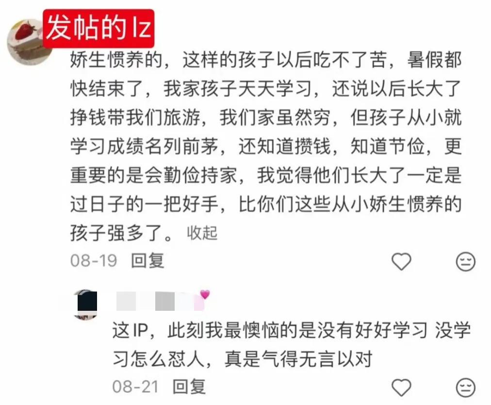 “娇生惯养的,这样的孩子以后吃不了苦,暑假都快结束了,我家孩子天天学习,还说以后长大了挣钱带我们旅游,我们家虽然穷,但孩子从小就学习成绩名列前茅,还知道攒钱,知道节位,更重要的是会勤俭持家,我觉得他们长大了一定是过日子的一把好手,比你们这些从小娇生惯养的孩子强多了。”