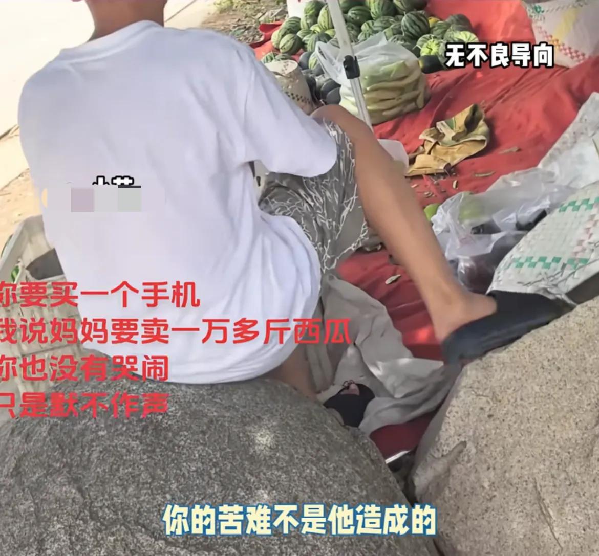他儿子听完了,并没有哭闹,儿子静静地继续帮妈妈卖西瓜。