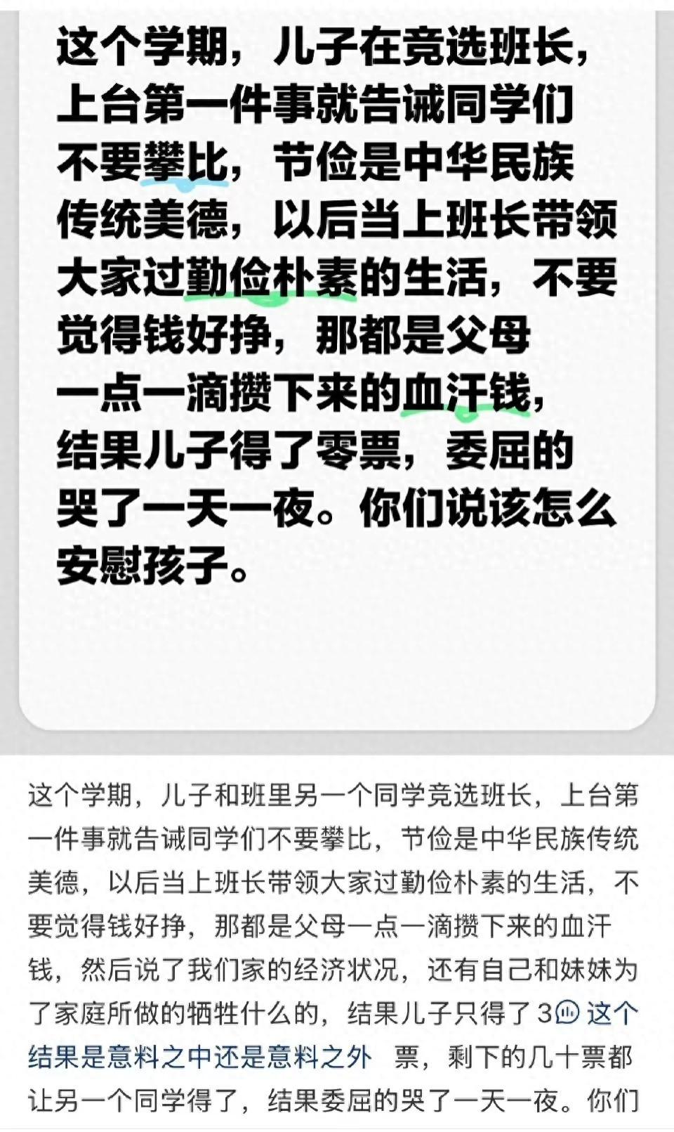 她儿子错失当班长的机会后,放学回到家哭了一天一夜,想不通自己为什么只有三票。