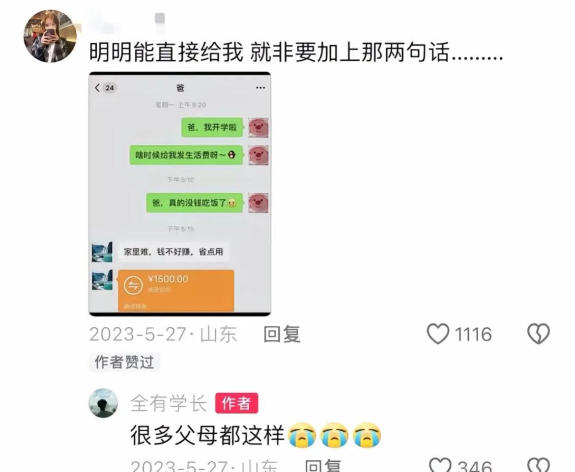 过了三四天后,爸爸依旧没有任何动静,只能又小心翼翼地给爸爸发了一条信息:“家里困难,钱不好赚,省点用。”